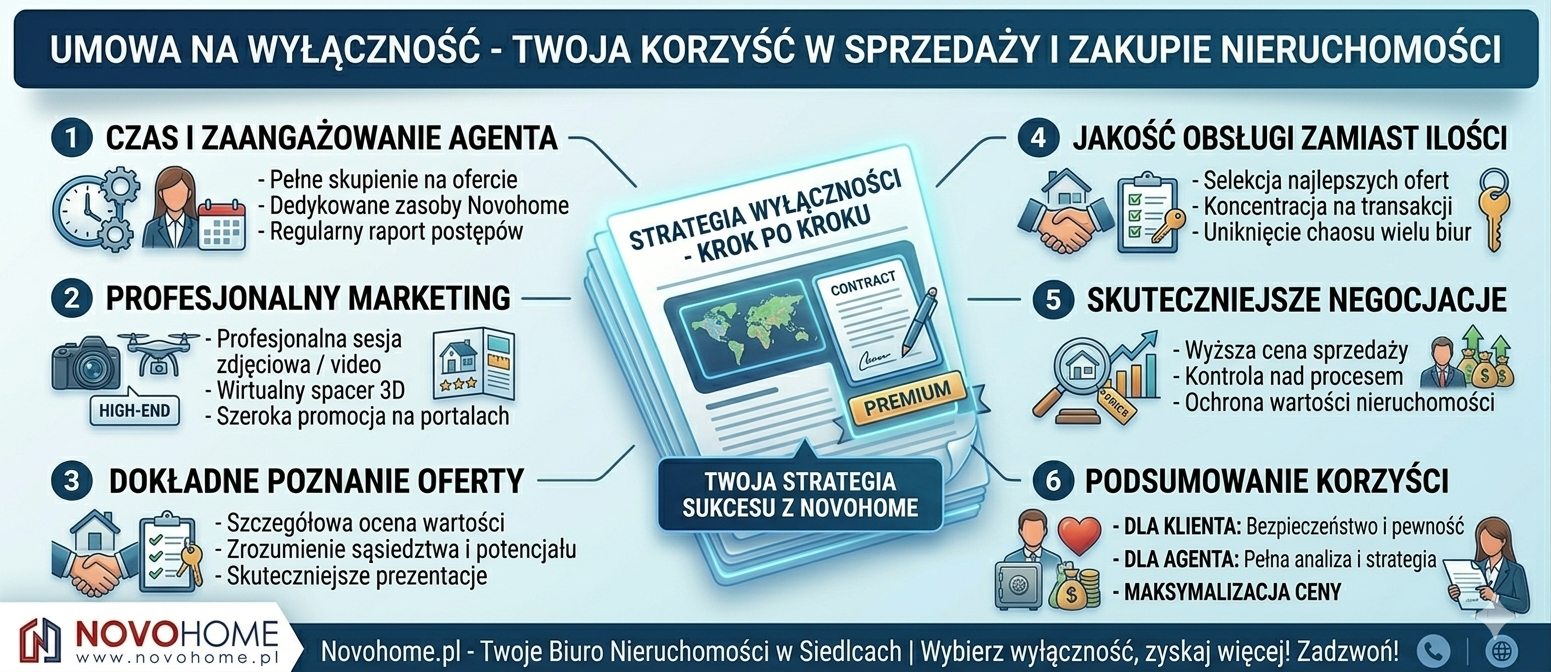 Wybierając wyłączność, inwestujesz w bezpieczeństwo transakcji, wysoką jakość obsługi i maksymalizację ceny sprzedaży, zamiast w chaotyczną konkurencję wielu biur.